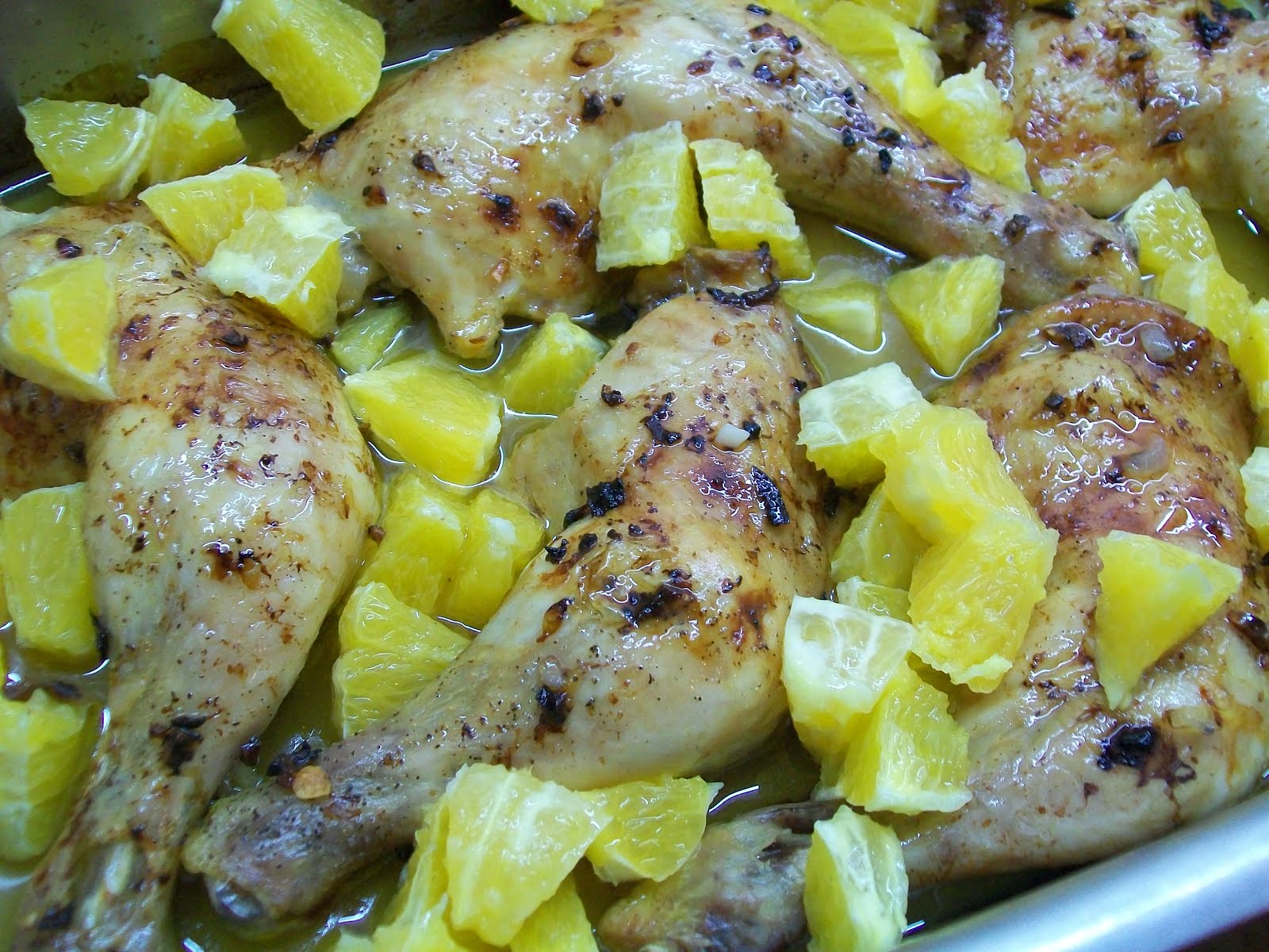 Descasque as duas laranjas e corte-as aos pedaços, na hora de servir coloque os pedaços junto do frango.